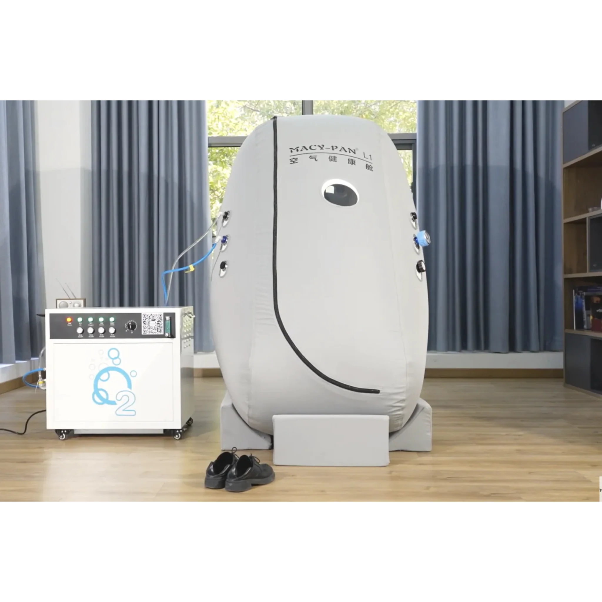 Designed for accessibility and relaxation, the Macy-Pan L1 Seated Hyperbaric Oxygen Chamber offers easy entry, exceptional comfort, and dependable oxygen performance. Its L-shaped zippered entrance and 63-inch interior height make it ideal for seated treatments—especially for users with limited mobility.